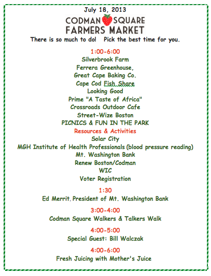 Codman Square Farmers Market on Thursday! by codmansquare Posted on July 17, 2013July 17, 2013 Image Share this: Click to share on Facebook (Opens in new window) Facebook Click to share on X (Opens in new window) X Like Loading... Related