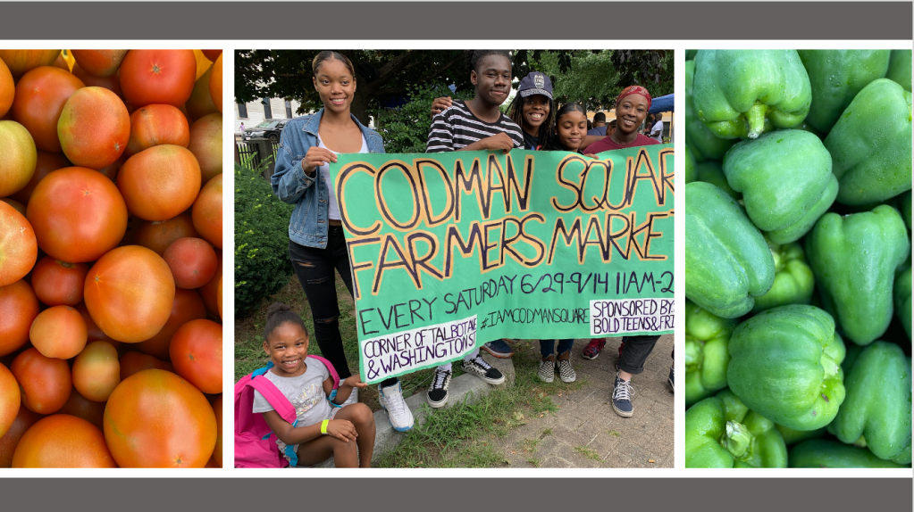 As we enter our 18th season, we keep our market vibrant and strong with food demonstrations, weekly themes and entertainment, family activities, free lunch for children through our partnership with Summer Eats, fitness activities and community building and organizing opportunities. We keep our market accessible and affordable by accepting SNAP and HIP and with coupon benefits through our partnership with the Office of Food Justice. To date, we have distributed more than $300,000 worth of food through this coupon benefit. We have also increased the use of the Codman Square Park and we are leading the capital improvement efforts at this park with the Boston Parks and Recreation Department. The Codman Square Farmers Market is organized by the Codman Square Neighborhood Council and the BOLD Teens. For more information, visit codmansquarefarmersmarket.org/