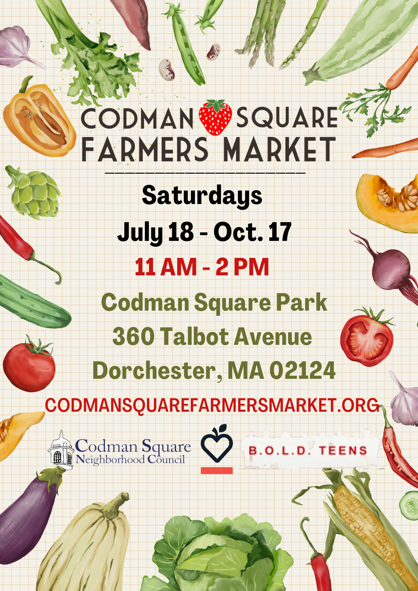 The Codman Square Farmers Market provides the community with fresh, local, organic produce; added value products from local vendors; education on nutrition; activities in the Codman Square Park and information about the Codman Square community and its stakeholders.