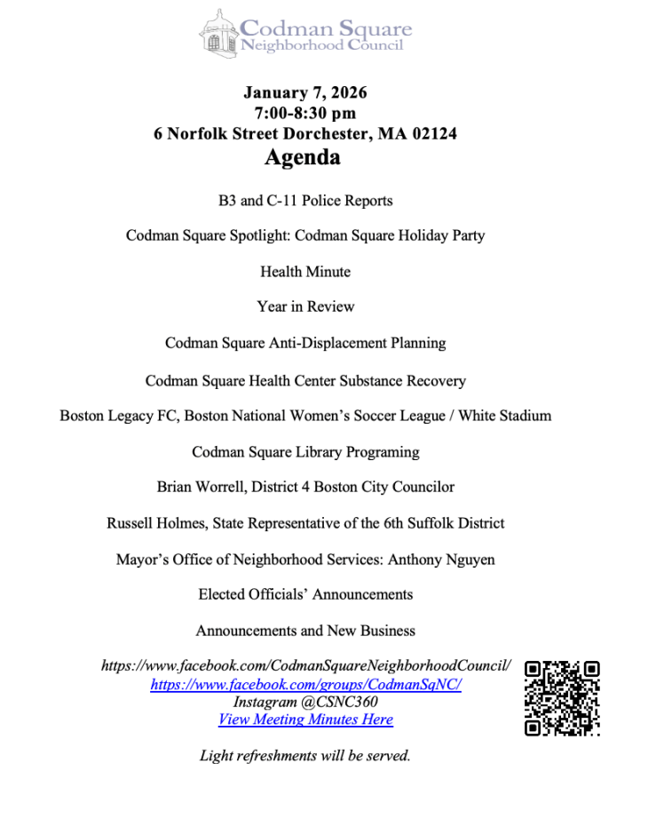 Our monthly board meetings are held the second Wednesday of every month from 6:30-7:30pm at 6 Norfolk Street, Dorchester, MA 02124 or virtually. For more information, contact us at csncouncil@gmail.com.