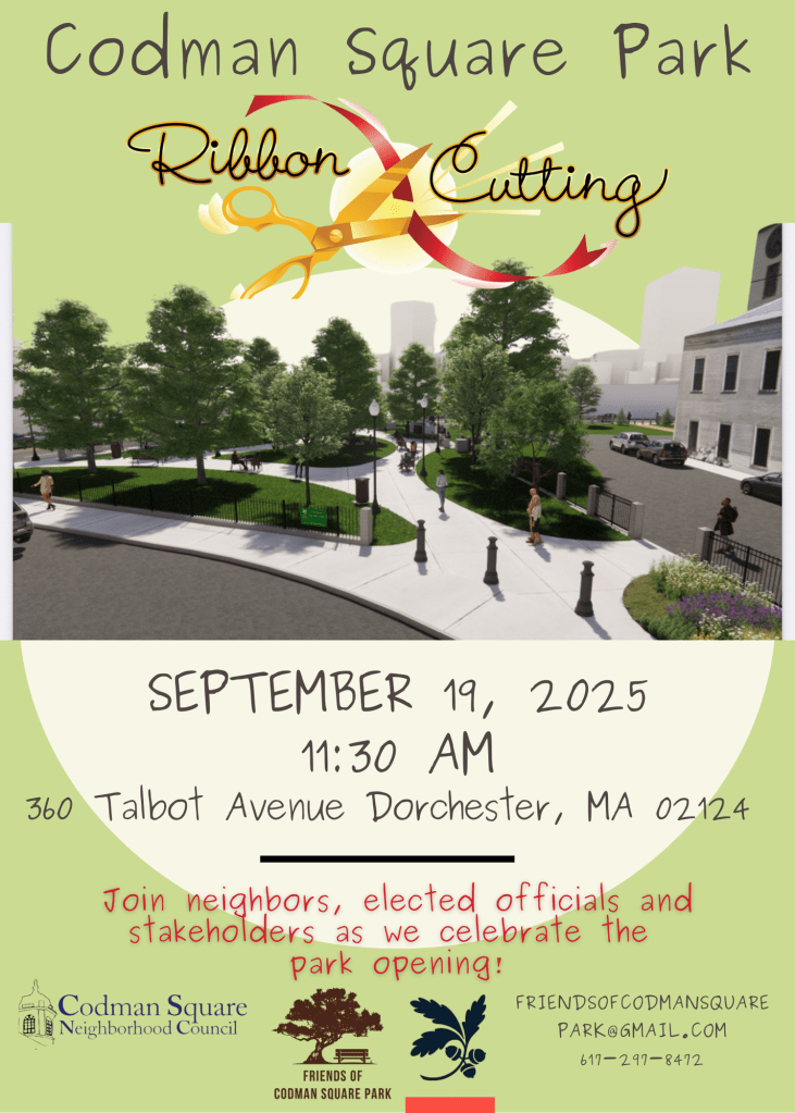 The Codman Square Neighborhood Council is seeking volunteers to get involved and to assist with anticipated fundraising for the implementation phase. Please email Cynthia Loesch-Johnson, CSNC.
