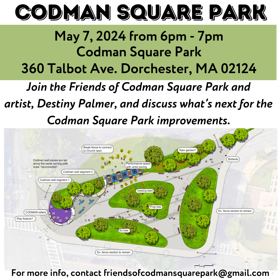 The public is invited to a series of public presentations and discussions, and to provide feedback on the Codman Square Park Redesign as follows: